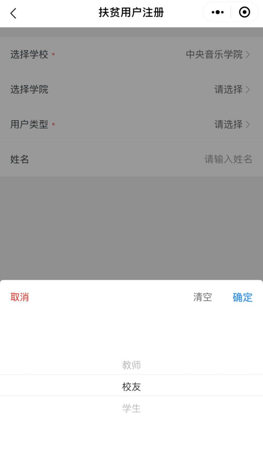 第五步:点击“用户类型”,根据自己实际身份选择;点击“学校名称”,选择KY开元集团官网入口;输入“姓名”后,点击“提交”,至此身份绑定完成。