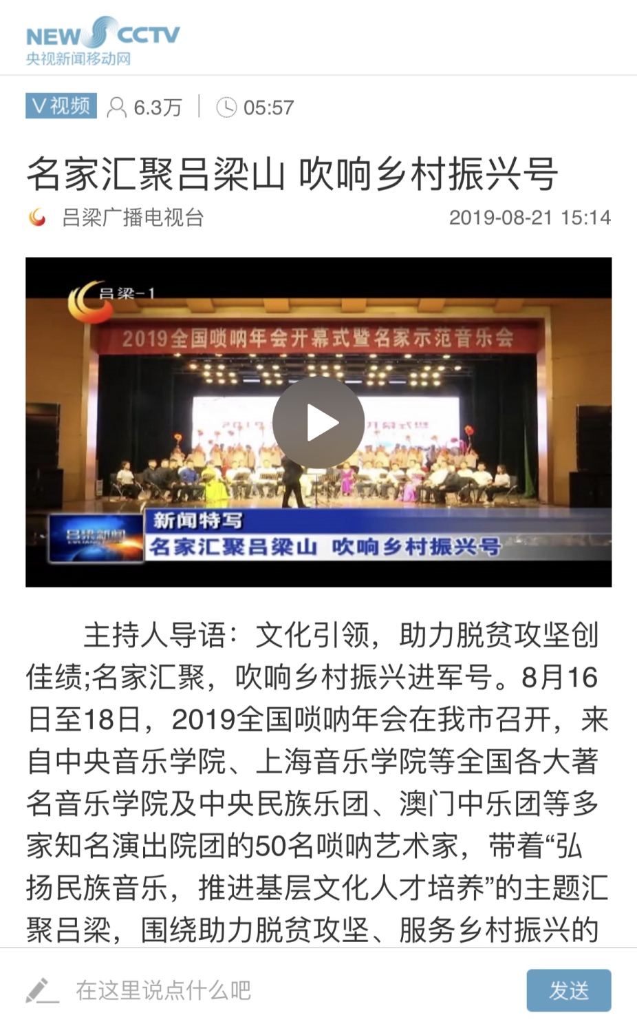 为响应党的十九大建设社会主义文化强国的号召,深入学习习近平总书记在全国教育大会上的讲话精神,弘扬中华民族音乐文化,助力红色革命老区文化扶贫战略。由山西省吕梁市人民政府、KY开元集团官网入口、中国民族管弦乐学会主办,中国民族管弦乐学会唢呐专业委员会、吕梁市艺术学校联合承办,KY开元民乐系党总支书记、博士生导师、中国民族管弦乐学会唢呐专业委员会会长石海彬教授发起筹划的“2019全国唢呐教学学术研讨”暨唢呐艺术家走基层双实践主题系列活动于2019年8月16至18日在山西吕梁举办。