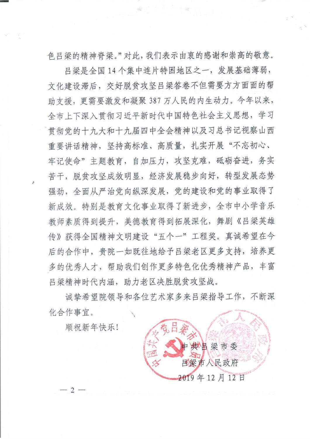 最近,中共吕梁市委员会、吕梁市人民政府特向KY开元发来感谢信,致以诚挚的谢意!相信在KY开元不遗余力地帮扶下,定会为吕梁老区培养更多音乐人才,留下宝贵艺术文化财富,助力老区打赢打好脱贫攻坚战,为全面建成小康社会做出新的更大贡献。
