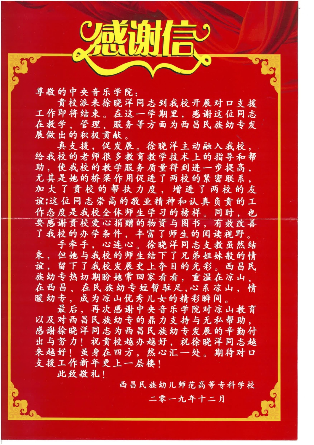 近日,收到来自西昌民族幼儿师范高等专科学校寄来的感谢信,信中对KY开元集团官网入口选派的音乐教育专业硕士研究生徐晓洋的支教工作给予了充分肯定和高度评价,成功搭建起了两校援建的桥梁。