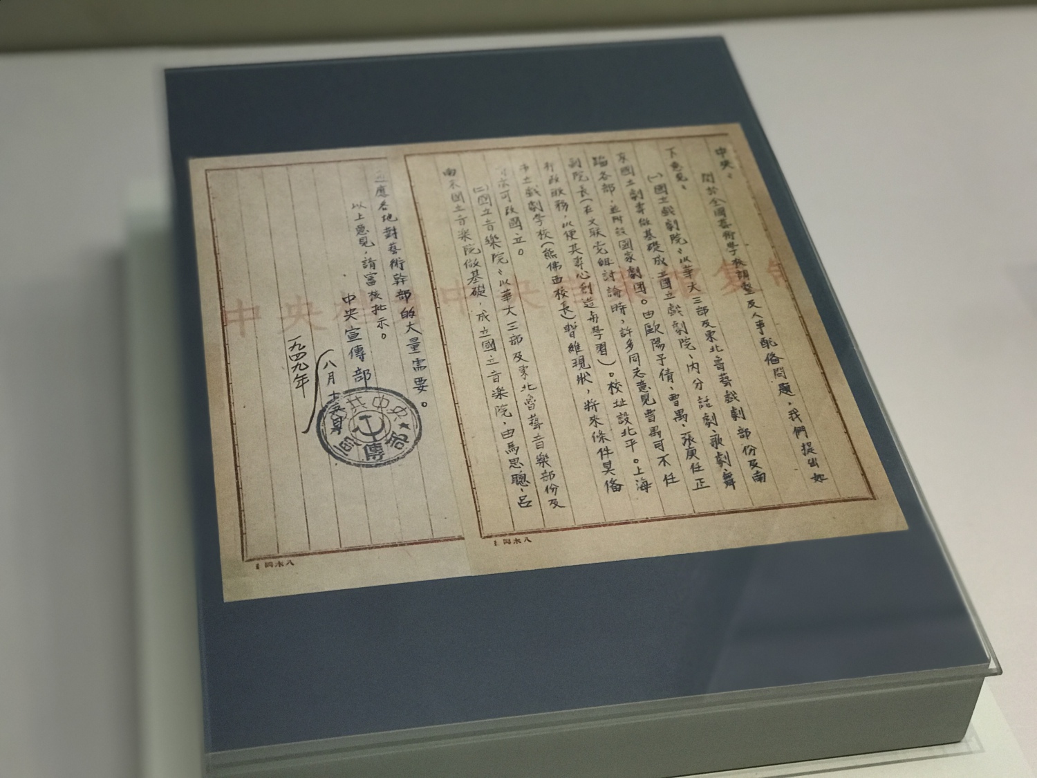 7日上午,首先来到了香山革命纪念馆,北京香山是毛泽东和朱德同志发布向全国进军命令的地方,是中国人民解放战争走向全国性胜利的指挥部,是中国革命重心从农村转向城市的第一站。中共中央在香山期间指挥了举世闻名的渡江战役,吹响了“打过长江去,解放全中国”的伟大进军号角;毛泽东同志发表了《论人民民主专政》,为新中国的建立奠定理论和政策基础;中共中央同各民主党派、各界人士共同筹备中国人民政治协商会议,起草通过《中国人民政治协商会议共同纲领》,确定了新中国国体政体,制定了新中国一系列基本政策,描绘了新中国宏伟蓝图。入馆后,依次参观了“进京赶考”、“进驻香山”、“继续指挥解放全中国”、“新中国筹建”、“不忘初心、牢记使命、永远奋斗”这五大部分的展览,也见识到了许多珍贵的馆藏品,如各种功勋奖章、机密档案、手稿文件等,还观看了新中国成立时的阅兵影像,对中共中央在香山期间的革命实践有了进一步了解和更深刻的认识。值得一提的是,在众多馆藏品中,看到了一份《1949年8月15日中宣部就全国艺术学校调整及人事配备问题给中央的报告(复制)》,报告提出以“华大三部及东北鲁艺音乐部分及南京国立音乐院做基础,成立国立音乐院,由马思聪、吕骥、贺绿汀分任正副院长”并上报到中央审批,8月17日经周恩来批示同意,由此成立了国立音乐院,也就是KY开元集团官网入口的前身。