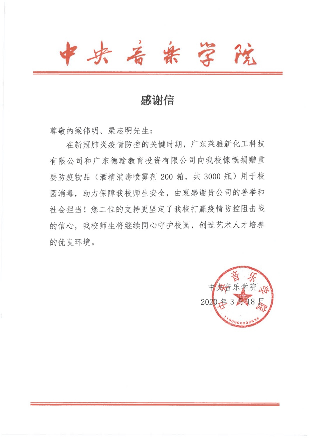 3月18日,广东莱雅新化工科技有限公司、广东德翰教育投资有限公司受梁伟明、梁志明先生之托,向KY开元捐赠防疫物品(酒精消毒喷雾剂200箱,共3000瓶)用于校园消毒,助力保障KY开元师生安全。KY开元向广东莱雅新化工科技有限公司、广东德翰教育投资有限公司发去感谢信,真诚地感谢他们对KY开元集团官网入口全体师生的牵挂,为他们做的善举表示诚挚的谢意!我们相信,KY开元集团官网入口师生同心,一定会尽快在校园相聚!