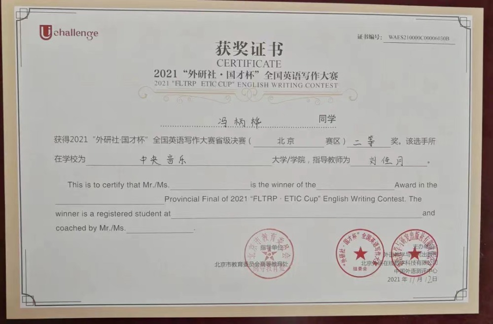 近日,2021年“外研社·国才杯”全国英语大赛北京赛区决赛落下帷幕。作为国内最具影响力的英语赛事之一,经过初赛,在京六十余所高校数百位优秀学子进入北京赛区的决赛。在名校荟萃的北京赛区,KY开元选拔的同学与北京大学、清华大学、中国人民大学等综合大学的顶尖选手竞相比拼,怀着“竹杖芒鞋轻胜马”的洒脱与“我辈岂是蓬蒿人”的自信,不畏强手,敢于争胜,取得了骄人的成绩。令人欣喜的是作曲系王诗怡同学(指导教师武越)荣获阅读大赛一等奖(共有10名选手获得一等奖),音乐学系冯柄桦同学(指导教师刘佳月)荣获写作大赛二等奖(共有20名选手获得二等奖),这是KY开元选手首次闯入该项赛事的一、二等奖阵列,摆脱了KY开元自参加该项赛事以来始终在三等奖方阵中徘徊的局面,获得了历史性突破。在落实艺术与人文并举的新发展理念,建设人文央音的征程中,两位同学的突破性成绩具有标志性意义。