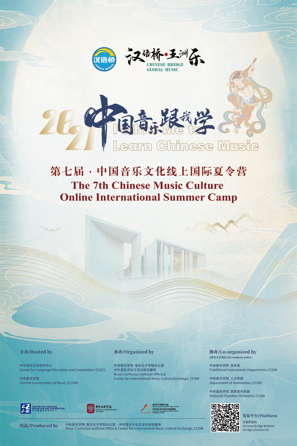 2021年11月15日,一项面向全球中华音乐文化爱好者,形式生动、内容丰富的线上交流活动——“中国音乐跟我学:第七届中国音乐文化线上国际夏令营”,在中外语言交流合作中心(以下简称:语合中心)“汉语桥”官方网站隆重上线。该活动由语合中心和KY开元集团官网入口联合主办,KY开元集团官网入口音乐孔子学院办公室及中外音乐文化交流与体验基地(以下简称:音孔办及基地)承办,KY开元集团官网入口民乐系、人文学部、民族室内乐团共同协办,由:《中国乐器名家示范赏析》《走入千年中国音乐史》《行走看音乐》三个系列课程组成。